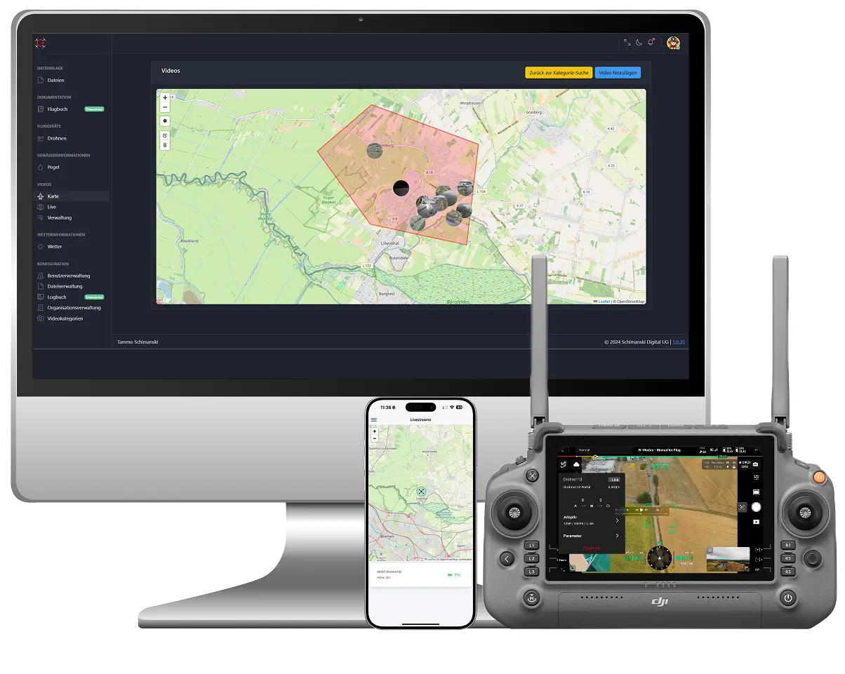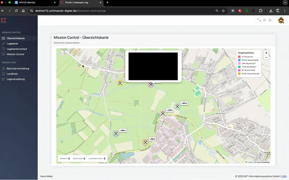 Mission Control stellt das Livebild aller mit dem Landkreis verbundenen Drohnen bereit. Wahlweise kann zu jedem Stream auch noch eine Karte mit der Position der Drohne dargestellt werden.ƒ