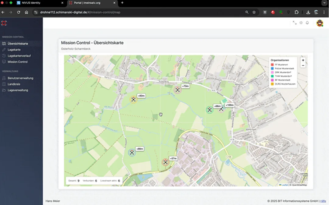 Im Bild: Im dargestellten Ausschnitt der Übersichtskarte werden die Drohnen sechs verschiedener BOS-Einheiten zeitgleich und in Echtzeit dargestellt.