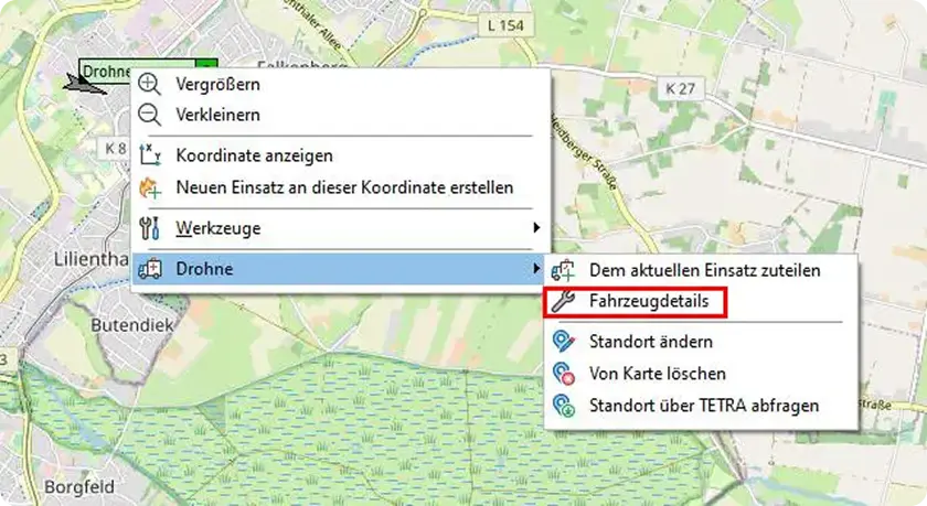 Sobald der Livestream gestartet wird, erscheint die Drohne mit kurzer Verzögerung als Einsatzmittel auf der Karte. Per Klick auf das Fahrzeugdetails-Symbol können weitere Informationen zur Drohne angezeigt werden.
