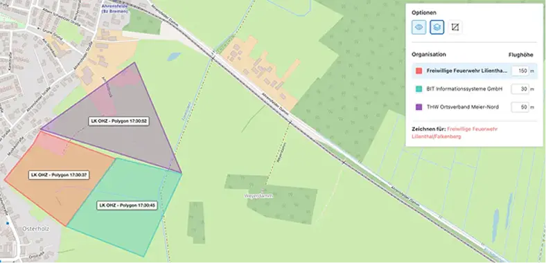 Die Übersichtskarte für Landkreise stellt die Positionen aller angeschlossenen Drohnen inkl. der aktuell geflogenen Höhe dar und dient somit dazu, das aktuelle Geschehen im Blick zu behalten.